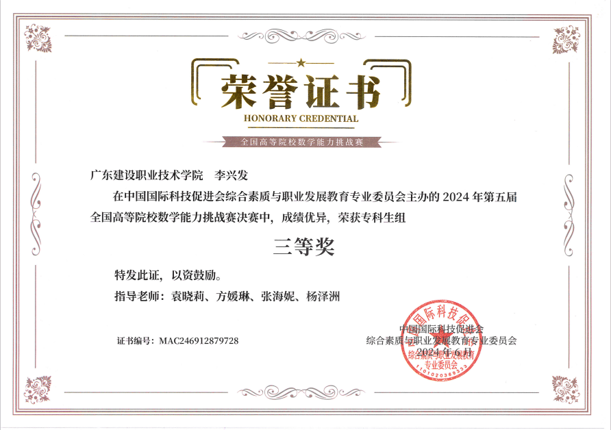 2024年6月,由中国国际科技促进会综合素质与职业发展教育专业委员会主办的第五届全国高等院校数学能力挑战赛成功举办。广东建设职业技术学院公共课教学部首次带队参赛,并申请作为第五届全国高等院校数学能力挑战赛的协办单位。我们高度重视本次赛事,提前半年进行竞赛筹备,严格遵循大赛要求及学校学科竞赛管理相关规定制定竞赛承办工作方案。比赛期间,赛项各环节组织工作井然有序,圆满完成了该赛事组织的各项工作。